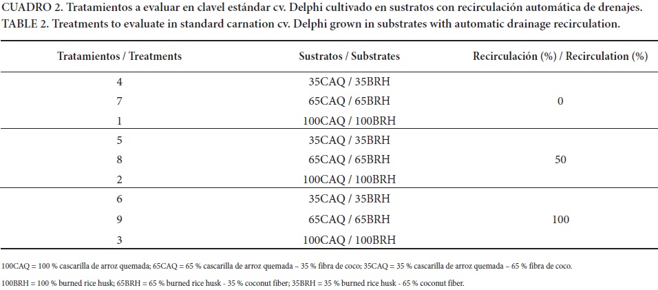 Se acondicionó un invernadero tradicional en madera con cuatro secciones de 6.8 x 65 m cada una, con ventilación lateral y cenital pasiva. Se utilizó clavel estándar cv. Delphi sembrado en sustrato a una densidad de 24.3 plantas·m-2 de invernadero, en camas suspendidas de 15 x 0.8 m, con riego a presión y goteros de 1.2 Lph cada 20 cm.