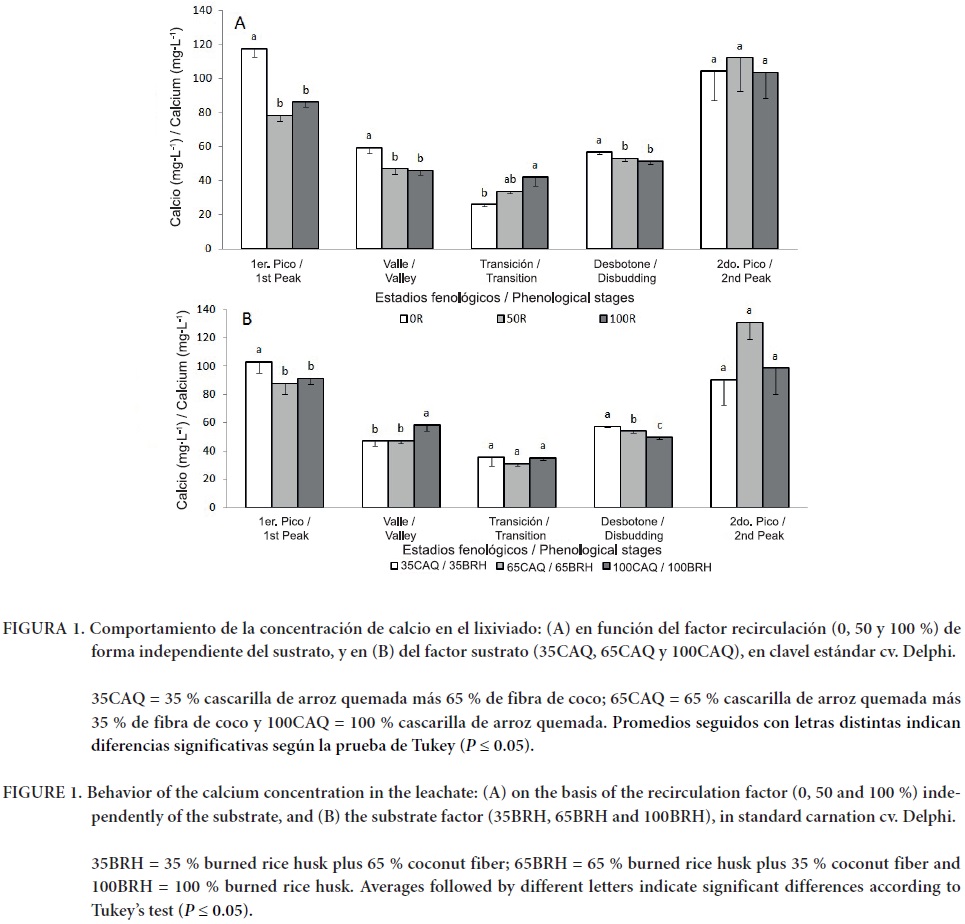 La concentración de calcio en función de la recirculación y de los sustratos presenta una tendencia similar, mostrando las concentraciones más altas en la primera y en la última etapa fenológica. Se aprecia que la concentración del ion en función de la recirculación tiende a ser mayor en los tratamientos sin recirculación, con diferencias significativas entre los tratamientos en algunas etapas (Figura 1A). Por otro lado, la concentración de calcio en función de los sustratos fue significativamente mayor en el tratamiento con menor contenido de CAQ, en las etapas fenológicas "primer pico" y "desbotone" (Figura 1B).