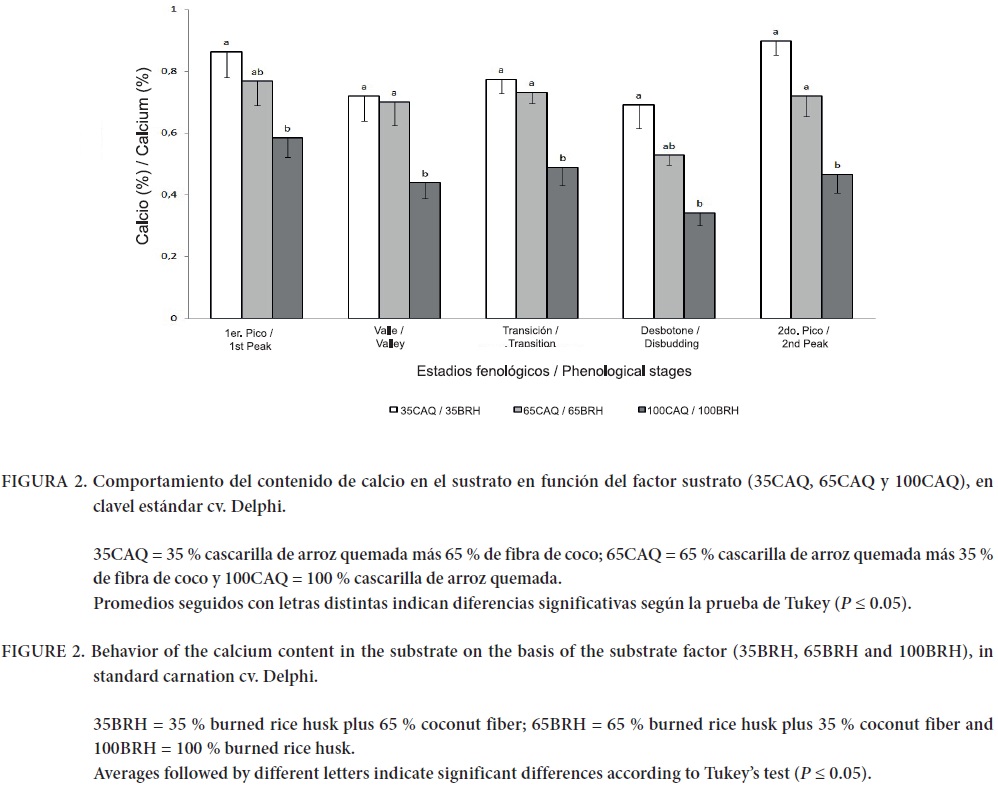 Este comportamiento es contrario al reportado por Fernández et al. (2006), quienes encontraron en clavel estándar variedad Nelson que los contenidos de calcio en el sustrato eran excesivos para el sustrato 100CAQ.