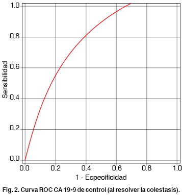 Patients and methods: We included 54 patients with a diagnosis of obstructive-origin jaundice. They were divided in two groups according to the final diagnosis, malignant disease vs. benign disease. Serum CA 19-9 was determined at admittance and once cholestasis had been resolved, and the levels were correlated with the final diagnosis.