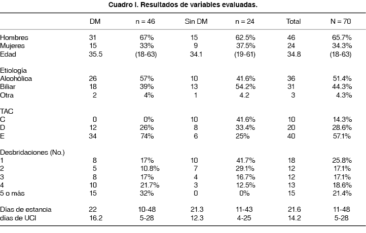 De un grupo total de 137 pacientes con sepsis pancreática y/o peripancreática que requirieron tratamiento quirúrgico mediante necrosectomía, con 70 pacientes se conformó un grupo de estudio, 67 se eliminaron; 33 por fallecimiento (24%), 26 por seguimiento incompleto (18.9%) y 8 por DM previa al evento de PA (5.8%). De estos 70 pacientes, 46 (65.7%) desarrollaron DMS durante su seguimiento y 24 (34.3%) no, la edad promedio fue de 34.8 años (rango 18-63), 46 fueron hombres (65.7%) y 24 mujeres (34.3%). La etiología fue alcohólica en 36 pacientes (51.4%), biliar en 31 (44.3%) y por otras causas en 3 (4.3%); destacando dentro de la etiología alcohólica la adicción conjunta a cocaína y alcohol en 9 casos (19.6%) (Cuadro I).