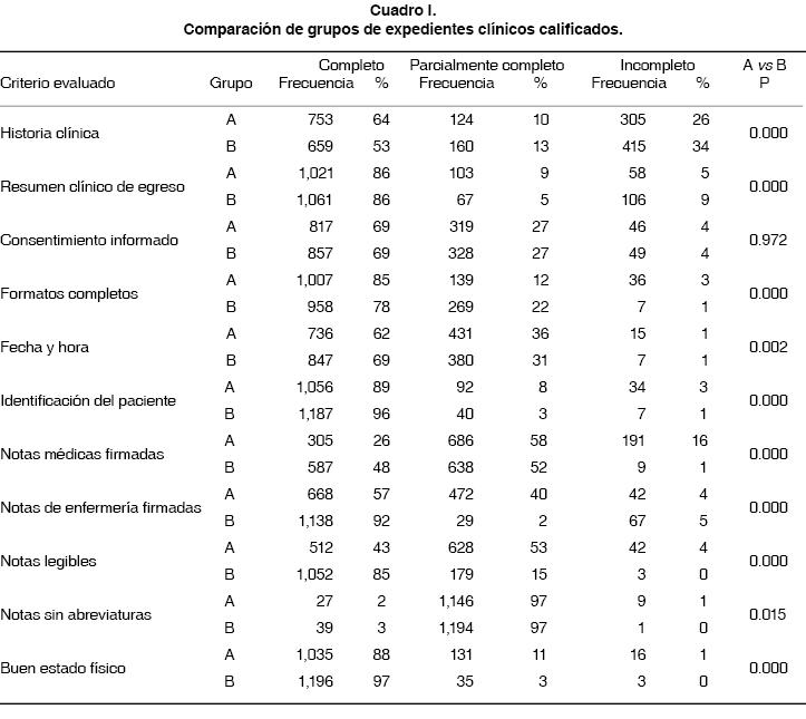A este respecto, en este estudio se observó una diferencia al comparar ambos grupos en la categoría ''completos'', es decir, sin utilización de abreviaturas (2% para el grupo A y 3% para el B), con valor de P = 0.015. Adicionalmente se mantuvo la proporción de expedientes ''parcialmente completos'' (97% para ambos grupos).