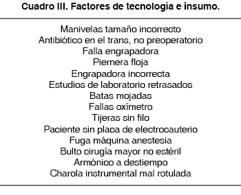 Resultados: En los 60 pacientes en los que se aplicó la lista de verificación se detectaron 36 eventos que alteraron el flujo normal de la cirugía sin impactar en el paciente y, de éstos, 13 fueron cuasifallas. Las cuasifallas detectadas fueron una fuga de Sevorane y fuga de oxígeno en máquinas de anestesia, falta de una aguja de sutura en el conteo final, que se encontró en cavidad, bultos de cirugía mal esterilizados con batas húmedas, falla en engrapadora quirúrgica por mal manejo del personal, engrapadoras erróneas para procedimiento a realizar, paciente bajo bloqueo espinal al que no se le sujetaron los brazos y ocasionó contaminación del campo quirúrgico. Todos estos hechos ocasionaron una disrupción del flujo quirúrgico.