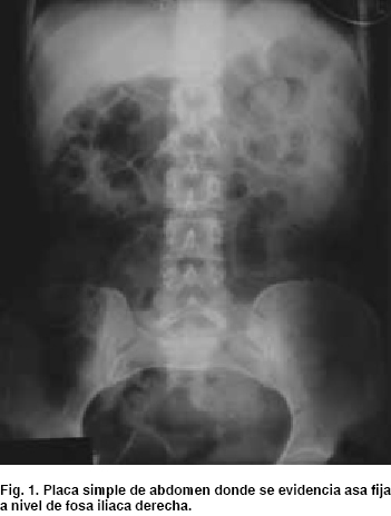 En la placa simple de abdomen se evidencia asa fija a nivel de fosa iliaca derecha y nivel hidroaéreo a este nivel (Figura 1). En el rastreo sonográfico abdominal, se evidencia líquido libre en cavidad a nivel de fosa iliaca derecha.