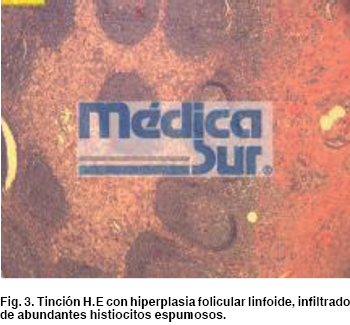 Diagnóstico: Hiperplasia folicular linfoide, infiltrando abundantes histiocitos espumosos, apendicitis xantogranulomatosa (Figura 3).