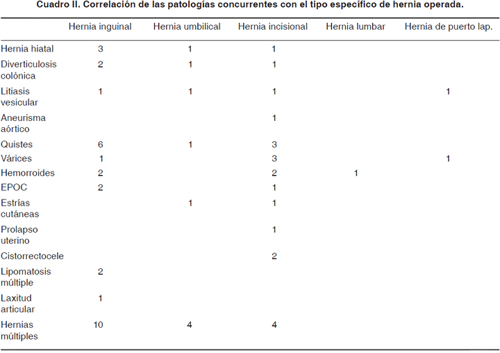 De los pacientes interrogados, 28 admitieron el hábito de fumar tabaco (58%) y 33 pacientes (67%) tuvieron historia familiar de hernias (Cuadro I). En el cuadro II se muestra la correlación de las patologías concurrentes con el tipo específico de hernia operada.