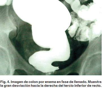 Diagnóstico por imagen La placa simple de abdomen hace evidente, a nivel del sacro, calcificaciones secundarias a microtrombosis de los vasos del hemangioma, causados por inflamación perivascular y éstasis del flujo sanguíneo; estas calcificaciones son llamados flebolitos; su presencia es un signo patognomónico en esta patología; se pueden encontrar entre un 26-50% (Figura 3). Además existe desviación de la columna de aire del recto, siendo más notorio en el colon por enema con contraste de bario donde se demuestra un desplazamiento del recto como efecto de compresión extrínseca (Figura 4). Existe también el aspecto de seudopólipos en la mucosa por la gran dilatación venosa submucosa; en otros casos puede dar la apariencia de una obstrucción circunferencial de la luz.4,7,10,11,15,16,18,22