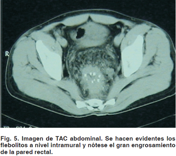 La TAC abdominal con contraste oral e intravenoso muestra engrosamiento de la pared del segmento del recto afectado; además suele mostrar vasos perirrectales dilatados y la presencia de flebolitos a nivel intramural o extrarrectal abarcando el mesorrecto16 (Figura 5). Al tratarse de una patología vascular existe reforzamiento de la lesión con el empleo del medio de contraste intravenoso iodado.12 La RMN con sonda endorrectal puede delimitar adecuadamente las lesiones, su profundidad en las diferentes capas del recto y en el complejo esfinteriano, así como la extensión a órganos pélvicos, y de una forma más eficaz que la RMN simple, además de poder evaluar más detalladamente la extensión del hemangioma de una manera preoperatoria.9,20 En imágenes T1, se muestra un marcado engrosamiento de la pared del recto, así como la afección a los vasos perirrectales, demostrando numerosos vasos dilatados de aspecto serpentiginoso. En imagen T2 se demuestra engrosamiento de la pared rectal y aumento en la intensidad del mesorrecto, definiendo con mayor claridad el espacio perirrectal y la extensión o no de la pared vesical posterior. La claridad de las imágenes nos ayuda a evaluar la invasión hacia la pelvis, fosa isquioanal, glúteos y nervio ciático.9,16,20,26,27