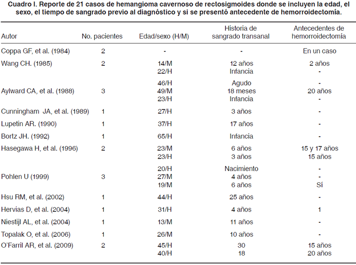 En el cuadro I se muestra un análisis de 21 pacientes descritos por varios autores, donde se reportan la edad (entre 14 y 65 años, media de 30), el género (predominantemente masculino) y el número de años de sangrado transanal previo al diagnóstico de hemangioma cavernoso, que se reporta desde edades tempranas y adolescencia. El antecedente de hemorroidectomía previa se puede ver en casi la mitad de los pacientes. Se incluyen en el cuadro dos casos diagnosticados en nuestro Servicio; ambos correspondieron al género masculino, de entre 40 y 45 años de edad, con antecedente de hemorroidectomía previa; llama la atención que uno de ellos tiene antecedente de 30 años con sangrado transanal y otro con 18 años; no se detectó anemia crónica debido a la poca evidencia de sangrado transanal; desafortunadamente, ninguno aceptó tratamiento quirúrgico a pesar de explicarles el beneficio de la cirugía; se mantienen en vigilancia hasta este momento.