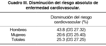 El bypass gástrico disminuyó el riesgo absoluto de una enfermedad cardiovascular a 10 años en un 43.8% (DS 27.32) en el grupo masculino y 20.6% (DS 25.40) en las mujeres. En el total de la muestra la disminución fue de 25.3% (DS 27.25) (Cuadros II y III).