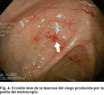 La complicación más frecuentemente observada fue la erosión leve de la mucosa por fricción de la punta del endoscopio en el ciego, esto en cuatro enfermos (20%); lo cual no ameritó ningún tratamiento, ni médico, ni endoscópico. No hubo perforación ni sangrado en ningún caso (Figura 4).