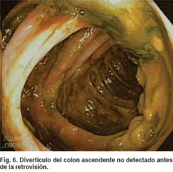 La maniobra de retrovisión aportó un diagnóstico endoscópico adicional en 3 enfermos (15%) al poder ser observadas las lesiones que, a la vista convencional, no pudieron ser detectadas. En dos casos se observaron pólipos pequeños (3-5 mm) del ciego en el lado proximal de los pliegues, uno de ellos sésil y de tipo aserrado; en otro, un divertículo del ciego (Figuras 5 y 6).