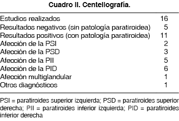 La centellografía se realizó en 16 pacientes, de los cuales resultó negativa (sin patología paratiroidea identificada) en cinco casos; patología multiglandular en uno (6.25%); en otro, posible patología infiltrativa versus mielodisplásica. No se identificaron glándulas ectópicas por este medio (Cuadro II) La sensibilidad fue del 50%, especificidad del 79%, valor predictivo positivo del 53% y valor predictivo negativo del 77%.