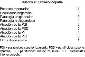 De 11 pacientes los resultados ultrasonográficos mostraron patología uniglandular en cinco casos y multiglandular en cuatro; la glándula que se encontró más afectada fue la paratiroides superior derecha (45%), y en un caso se reportó un nódulo tiroideo que correspondió histológicamente a un adenoma paratiroideo. La sensibilidad fue del 57%, especificidad del 76%, valor predictivo positivo 53% y valor predictivo negativo 79% (Cuadro III)