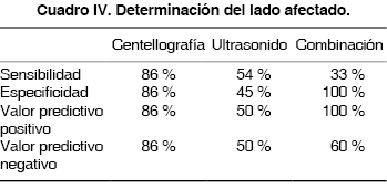 De la misma manera, se calculó la exactitud de estas pruebas para determinar el lado afectado; la centellografía mostró una sensibilidad del 86%, especificidad del 86%, valor predictivo positivo del 86% y valor predictivo negativo del 86%. En el ultrasonido encontramos una sensibilidad del 54%, especificidad del 45%, valor predictivo positivo del 50% y valor predictivo negativo del 50% (Cuadro IV)
