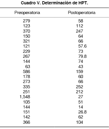 En cuanto a la efectividad quirúrgica, se encontró una disminución de las cifras de hormona paratiroidea (HPT) en el 95.2% de los pacientes, con una disminución de los niveles preoperatorios de esta hormona, en promedio de 190 pg/ml (Cuadro V)