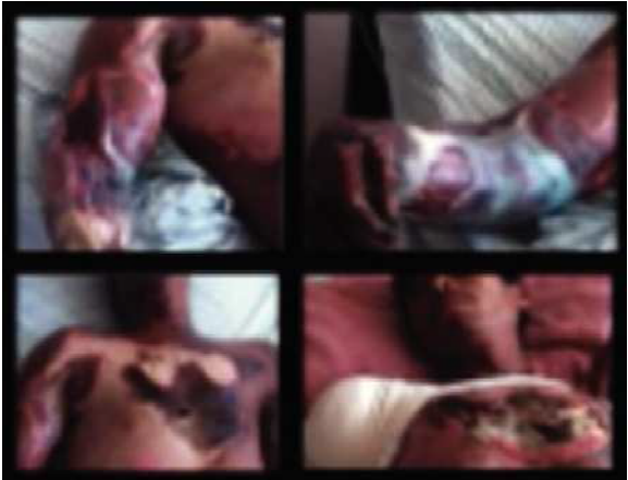 Figura 6. Hombre de 30 años. Lesión por alto voltaje que entró por las manos y salió en el tórax. Interesó el 5% de la superficie corporal. Requirió traqueostomía y laparotomía exploradora por dolor abdominal severo por vasoespasmo mesentérico secundario. También recibió injertos de piel en la espalda. Treinta días de estancia hospitalaria.