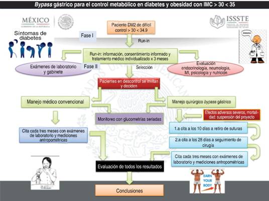 En el Hospital Regional de Alta Especialidad de Monterrey, ISSSTE, se realizó este estudio en 47 pacientes con DM2 y obesidad grado 1, 28 del sexo femenino y 19 del masculino, entre los 28 y 60 años de edad. Después de haber cumplido con la fase 1 y 2 del run-in, se llevó a cabo bypass gástrico en 13 pacientes (ocho mujeres y cinco hombres, media de edad = 47.3 años), y manejo médico convencional en 34 (20 mujeres y 14 hombres, media de edad = 54.1 años).