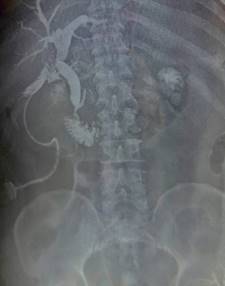 Figura 3: Colangiografía transoperatoria que revela paso de material desde ambos conductos hepáticos hacia duodeno (pliegues semicirculares). Se observa fuga, la cual se manejó con drenaje aspirativo blando.