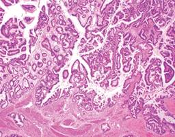Por otro lado, el CAVB es el cáncer más frecuente de la vía biliar, 80% con respecto al colangiocarcinoma, se encuentra de manera más común en fundus (60%), cuerpo (30%) y cuello (10%), el tipo histológico más frecuente es el adenocarcinoma, se considera invasor al sobrepasar la muscularis propia, es decir, los estadios T1a (Figura 4); es frecuente encontrar casos con perforación del peritoneo visceral e invasión a órganos adyacentes, sin embargo, el diagnóstico intraoperatorio y tratamiento radical sólo se realiza en menos de 1% de los casos.8-10