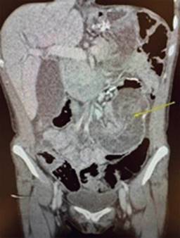Figura 1: Tomografía computarizada de abdomen y pelvis con contraste que evidencia intususcepción de asa intestinal, pero que el informe radiológico describe como “hernia interna”.