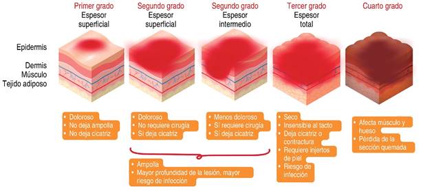 Figura 1: Las quemaduras de primer grado (grosor superficial, que afectan sólo a la epidermis) suelen ser benignas, muy dolorosas, no dejan cicatrices y no requieren cirugía. Las quemaduras que se extienden hasta la capa subyacente de la piel (dermis) se clasifican como de espesor parcial o de segundo grado; estas quemaduras frecuentemente forman ampollas dolorosas; van desde espesores parciales superficiales, que son homogéneos, húmedos, hiperémicos y palidecen, hasta espesores parciales profundos, que son menos sensitivos, más secos, pueden tener un patrón reticular al eritema y no palidecen. Las quemaduras de tercer grado (espesor total) y cuarto grado requieren cirugía y generalmente se presentan casi sin dolor.