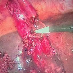 4. Corroborar un adecuado cierre del remanente vesicular, se procede a hacer resección del tejido que queda por arriba de la ligadura para posteriormente realizar una mucoclasia con energía monopolar utilizando el modo spray (40 watts) (Figura 4).