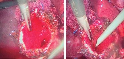 2. Realizar sección transversa de toda la circunferencia de la vesícula biliar para evacuar su contenido e identificar el conducto cístico desde el interior de la vesícula (Figura 2).