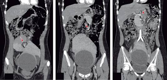 Figura 2: Tomografía abdominopélvica contrastada en la cual podemos realizar seguimiento de arteria esplénica hasta su origen en el tronco celíaco. Diferentes cortes en donde se muestra con flecha roja el seguimiento de la arteria esplénica.