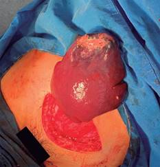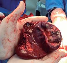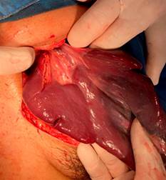 A la exploración física se logra palpar tumor delimitado, móvil, de aproximadamente 9 × 8 cm en cuadrante inferior izquierdo, sin datos de irritación peritoneal, se complementa abordaje con laboratorios en los que se reporta biometría hemática y química sanguínea dentro de parámetros normales, Ca-125 17 U/ml, tomografía abdominopélvica que reporta imagen compleja dependiente de ovario izquierdo (Figuras 1 y 2). Se decide realizar laparotomía exploradora electiva, donde se encuentra presencia de bazo errante a nivel pélvico con quiste de 9 × 9 cm (Figuras 3 a 5), se realiza evisceración de bazo y drenaje de quiste, obteniendo 480 cm3 de contenido cetrino. Se solicita apoyo transoperatorio al Servicio de Cirugía General para la realización de esplenectomía, la cual se lleva a cabo con éxito. Útero, Anexos y resto de vísceras sin alteraciones. Evolución postoperatoria adecuada, con egreso a las 24 horas de su ingreso, continuando con protocolo de paciente postesplenectomizado por externo.