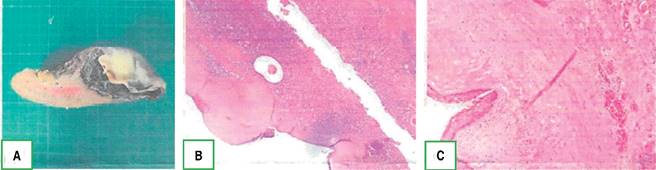 Figura 6: A) Espécimen de esplenectomía de 15 x 6 x 5 cm, peso de 167.5 gramos, con formación quística en un extremo de 8 cm de diámetro con superficie interna trabeculada. B-C) Formación quística con una cápsula fibrosa gruesa y una superficie interna tapizada por epitelio escamoso estratificado no queratinizante sin atipia. El parénquima presenta una pulpa roja con sinusoides con cambios por lisis. Pulpa blanca formada por folículos linfoides secundarios sin atipia.