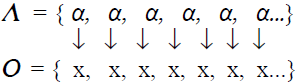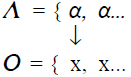 Ahora bien, piénsese en cualquier enunciado α, por ejemplo, en el teorema (1) el cual puede ser nombrado por la metavariable 'α'. Construyamos los conjuntos lenguaje (discurso) y objeto. Sabemos que Thales dice (1), y al decir (1), el cual es un enunciado α, dice algo (x). De esta manera tenemos una entidad del conjunto Λ (i.e. del lenguaje de Thales) y podemos introducir una entidad al conjunto O (el conjunto de los objetos). Con ello tenemos algo que se puede representar así: