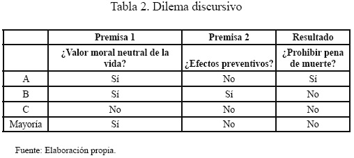 Esta disociación entre las intenciones y el texto resultante se agrava cuando en los argumentos que respaldan la aprobación de una ley se barajan proposiciones lógicamente interconectadas. Decimos que las proposiciones están lógicamente interconectadas cuando a una conclusión se llega "sí y sólo sf si se verifican dos o más premisas. Se ha demostrado que si en una deliberación los participantes esgrimen premisas lógicamente interconectadas, entonces las asambleas -constituyentes y legislativas- son susceptibles de incurrir en un "dilema discursivo" (véase Pettit, 2001; 2003). Pongamos que una asamblea se enfrenta a dos alternativas de decisión: si abolir la pena de muerte o autorizarla sólo para los homicidios dolosos. Supongamos que tenemos tres diputados. El primero defiende la prohibición absoluta de la pena de muerte, sobre la base de dos premisas: la primera, que la vida de las personas es igualmente valiosa "con independencia del uso que hayan hecho de ella, de sus contribuciones a la colectividad o su indiferencia hacia ésta, o si ha sido un buen ciudadano o malo" (Nino, 1992: 221-224). La segunda premisa es empírica, y defiende que la pena de muerte no tiene efectos preventivos, es decir, que su imposición no trae como consecuencia la disminución de los homicidios. Para este primer legislador, por lo tanto, la pena de muerte no tiene justificación alguna.