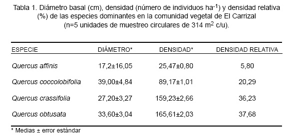 El componente arbóreo de la comunidad vegetal de El Carrizal está compuesto por nueve especies arbóreas, de las cuales Quercus crassifolia, Q. coccolobifolia, Q. obtusata y Q. affinis presentaron el mayor porcentaje de ocurrencia (Tabla 1). De los 177 individuos registrados en las cinco unidades de muestreo, dichas especies representaron el 89%, lo cual indica que son las más importantes en la dinámica vegetal de esta comunidad.
