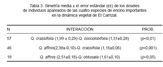 De los seis pares posibles de las cuatro especies de encino para el análisis de simetría de doseles, sólo tres de ellas ocurrieron en el sitio de estudio (Tabla 3). Faltaron los pares posibles de Quercus crassifolia con Q. obtusata y de Q. coccolobifolia con Q. affinis. Así, Quercus affinis se localizó apareado con Q. crassifolia y Q. obtusata, y ambas especies mostraron asimetría significativa de su dosel (Tabla 3). Al mismo tiempo, los doseles de Q. coccolobifolia se registraron significativamente distorsionados al estar emparejados con los de Q. crassifolia (Tabla 3).