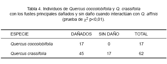 En relación con la integridad del tallo de los individuos de las especies apareadas con Q. affinis, los 17 individuos de Q. coccolobifolia localizados en el sitio de estudio, presentaron su tronco principal roto (Tabla 4, x2 = 9,7, p < 0,01). De modo similar, el 72% de los individuos de Q. crassifolia habían sufrido fractura de su tallo principal (Tabla 4, x2 = 5,7, P < 0,02).