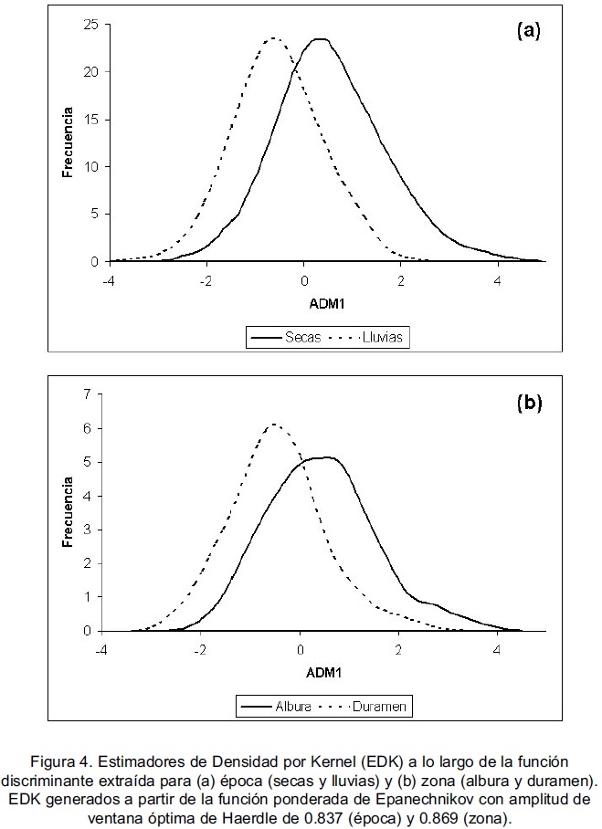 Para el caso del análisis con solo dos grupos (entre albura y duramen y entre secas y lluvias), considerando que el ADM solo extrae una función discriminante, se generaron estimadores de densidad por kernel (EDK) para poder observar las diferencias entre los grupos a lo largo de la función discriminante extraída. Se obtuvieron los EDK a partir de la función ponderada de Epanechnikov, con una amplitud de ventana óptima de Haerdle, utilizando el programa edk 2000 (SalgadoUgarte, 2000). En el caso del análisis con seis grupos esta observación se realizó al graficar las dos primeras funciones discriminantes.