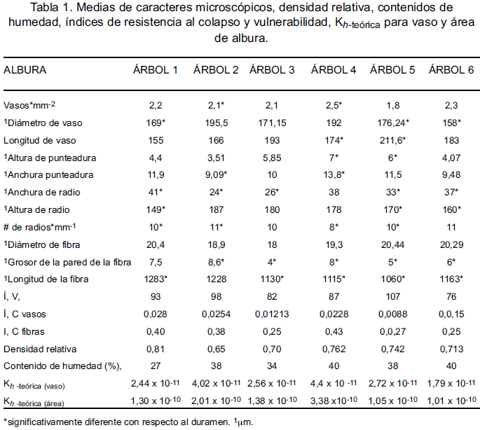En general se observa que solo algunos caracteres celulares logran separar la albura del duramen y resalta que las dimensiones celulares no son tan importantes para separar ambas zonas y épocas (tablas 1 y 2), lo que significa que tanto albura como duramen son semejantes en los periodos de secas y lluvias. Cabe resaltar que las diferencias en los contenidos de humedad y la densidad relativa son variables más importantes para diferenciar zonas y estaciones (Tabla 5).