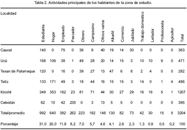 Las actividades principales de los habitantes de las viviendas, manifestadas por los informantes clave fueron la siguientes: estudiante (31%), actividades del hogar (20%), empleado (11,9%), pescador (8,2%), obrero (7,0%), campesino (5,7%), oficios diversos como plomero y electricista (4,6%), albañil (4,1%), comerciante (2,6%), jubilado (1,3%), trabajo doméstico asalariado (1,3%), leñador (0,9%), profesionista (0,5%) y apicultor (0,2%) (Tabla 2).