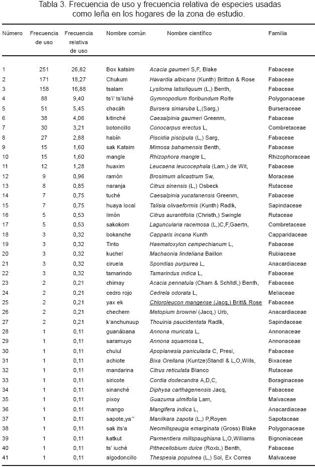 Las 13 especies principales, preferidas como leña y la frecuencia relativa en los hábitos de preferencia de los pobladores son: box katsim (Acacia gaumeri) 26,8%, chukum (Havardia albicans) 18,3%, tsalam (Lysiloma latisiliquum) 16,9%, ts'i' ts'ilché (Gymnopodium floribundum) 9,4%, chacáh (Bursera simaruba) 5,5%, kitinché (Caesalpinia gaumeri) 4,0%, botoncillo (Conocarpus erectus) 3,2%, habín (Piscidia piscipula) 2,9%, mangle ( Rhizophora mangle) 1,6%, sak katsim (Mimosa bahamensis) 1,6%, huaxim (Leucaena leucocephala) 1,3%, ramón (Brosinum alicastrum) 0,96% y naranja (Citrus sinensis) 0,85% (Tabla 3).