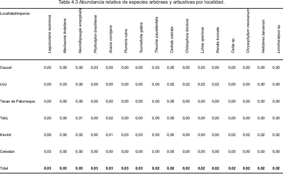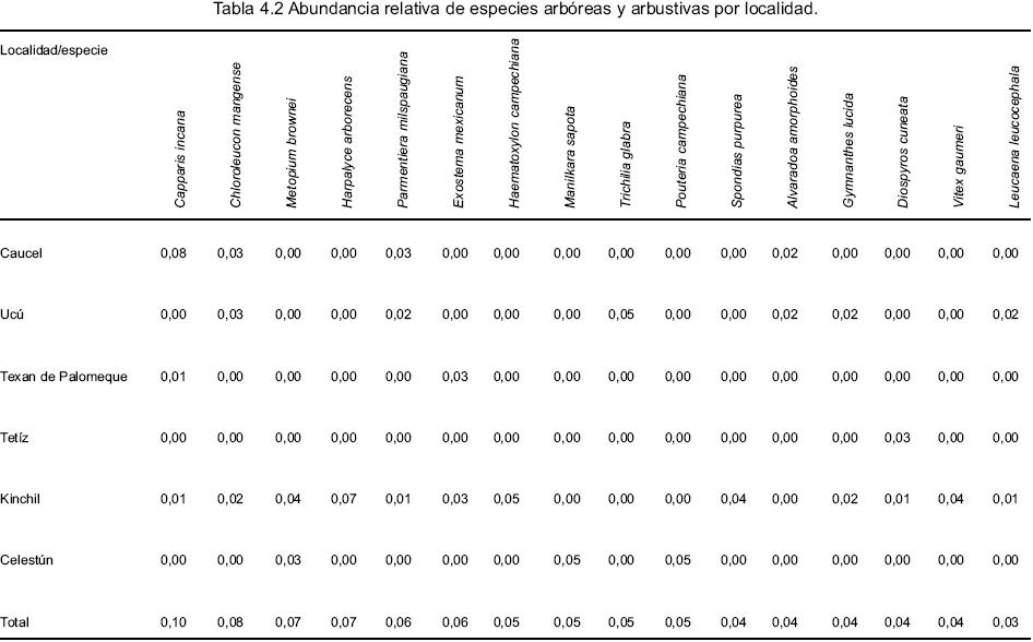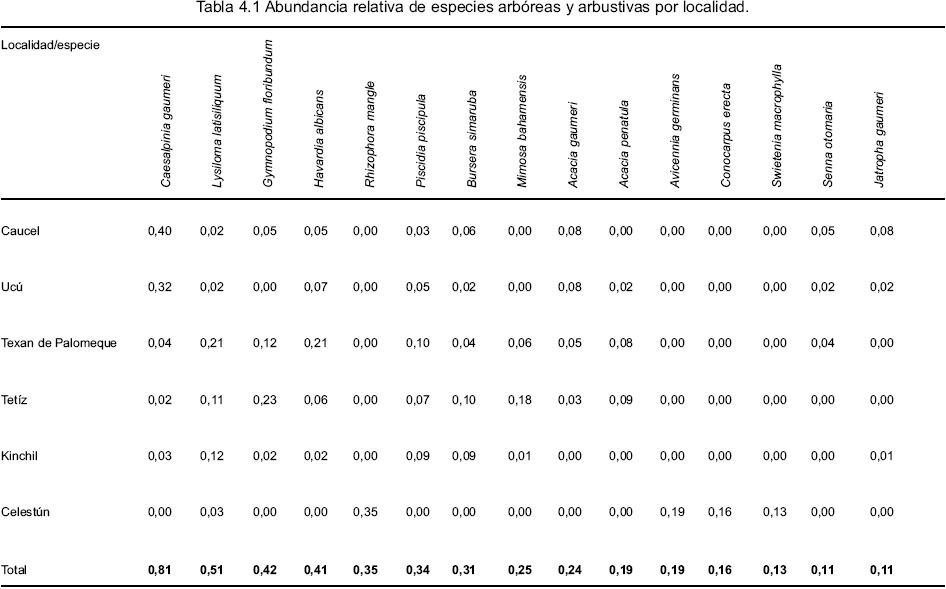 La información vertida por los informantes clave, sobre especies preferidas como leña coinciden, en su mayoría, con la abundancia relativa de las especies en los sitios de extracción, como se muestra en las tablas 4.1, 4.2, 4.3 y 4.4. Las especies más abundantes kitinché (Caesalpinia gaumeri), tsalam (Lysiloma latisiliquum), ts' i' ts' ilché (Gymnopodium floribundum), chukum (Havardia albicans), mangle (Rhizophora mangle), habín (Piscidia piscipula), chacah (Bursera simaruba), sak katsim (Mimosa bahamensis), box katsim (Acacia gaumeri) y botoncillo (Conocarpus erectus).