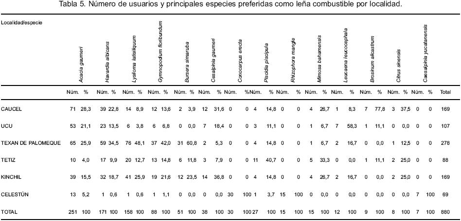 Cinco de las catorce especies mencionadas en la tabla 5 coinciden con lo reportado por Flores (2001), como especies preferidas para su aplicación como leña en las localidades de Sotuta, Chacmay, Dzan, Tizimín y Vallarta, estas son: box katsim (Acacia gaumeri), chukum (Havardia albicans), tsalam (Lysiloma latisiliquum), habín (Piscidia piscipula) y sac katsim (Mimosa bahamensis). El hecho que las especies que fueron reportadas en nuestro trabajo, no coincidan en su totalidad con las de Flores (2001), indican que sería necesario realizar inventario de uso de leña por región y poder valorar así el estado actual de las especies leñosas como recurso natural.