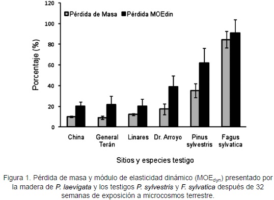 La madera de P. laevigata en contacto con microcosmos terrestre presentó una alta durabilidad contra los microorganismos degradadores de la madera, según se aprecia en la figura 1. La menor pérdida de masa se observó en los sitios China, General Terán y Linares con valores de 10 ± 1%, 9 ± 2% y 12 ± 1% respectivamente, mientras que en el sitio Dr. Arroyo, ubicado geográficamente más al norte, con rango de temperatura y precipitación más bajo que los tres sitios antes mencionados, la pérdida en masa fue mayor (17 ± 5%). Los valores de pérdida en masa presentados en los diferentes sitios fueron menores que los testigos P. sylvestris y F. sylvatica, cuyos valores fueron de 35 ± 7)% y 84 ± 10%, respectivamente.