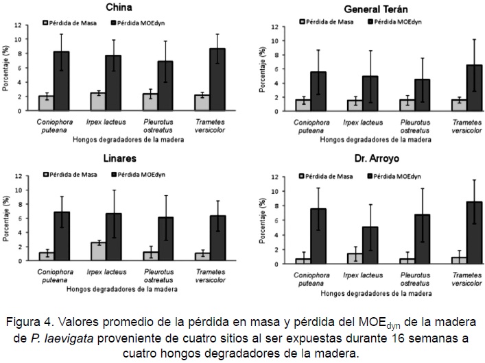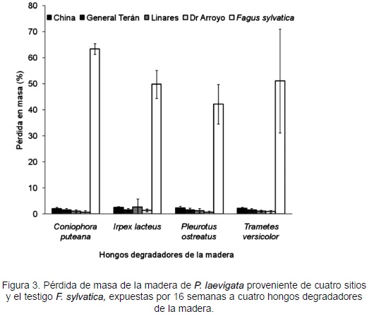 Las probetas de P. laevigata provenientes de cuatro sitios expuestas a los hongos: P. ostreatus, I. lacteus, C. puteana y T. versicolor, presentaron pérdidas en masa de 0,7 ± 0,5%, a 2,6 ± 3,2% después de restar 1,68% que corresponde a la pérdida de masa ocasionada por la lixiviación. Según la Norma Europea EN 113 considera válido un ensayo de degradación producida por hongos, cuando la pérdida de masa para la especie testigo de F. sylvatica es mayor a 12%.
