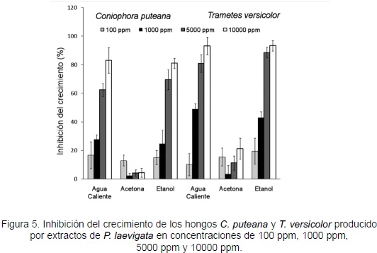 Los hongos C. puteana y T. versicolor, causantes de la pudrición café y pudrición blanca, respectivamente, muestran una fuerte inhibición en su crecimiento al colocarlos en un medio de cultivo con extractos de la madera de P. laevigata. Como se puede apreciar en la figura 5, los extractos en una concentración de 10 000 ppm obtenidos de la solubilidad con agua caliente presentan porcentajes de inhibición del crecimiento de 83 ± 8% y 93 ± 6% para C. puteana y T. versicolor, respectivamente.