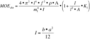 El MOEdin se calculó en probetas a punto de saturación de la fibra, mediante la inducción de vibraciones producidas por el golpe de un pequeño martillo en el punto medio de la probeta. La señal se registró con un transductor colocado a un extremo de la probeta a una distancia de 0,224 veces su longitud, el cual captura las frecuencias y las envía hacia el equipo GrindoSonic (Lemmers, Belgium) que muestra los valores de frecuencia en kHz. Los valores fueron registrados al inicio del ensayo, y posteriormente en las semanas 8, 16, 24 y 32. La información obtenida fue utilizada en las siguientes fórmulas para determinar el MOEdin: