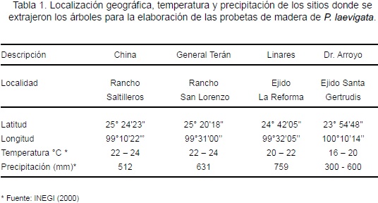 La durabilidad natural de la madera de P. laevigata fue determinada con probetas provenientes de 12 árboles extraídos en el estado de Nuevo León, de los sitios Rancho Saltilleros municipio de China, Rancho San Lorenzo, municipio de General Terán, Ejido La Reforma, municipio de Linares y Ejido Santa Gertrudis, municipio de Dr. Arroyo. De cada sitio se obtuvo información relacionada con las condiciones ambientales, incluyendo temperatura, precipitación y localización geográfica (Tabla 1). En forma adicional y para cumplir con los requisitos de las normas empleadas, se usaron probetas testigo de la madera de albura de Pinus sylvestris y Fagus sylvatica.