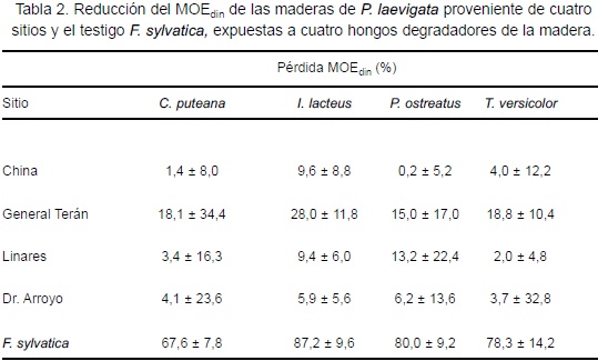 Los resultados de analizar las probetas mediante la pérdida del MOEdin se encuentran en la figura 4. En esta se puede apreciar que el sitio General Terán mostró mayor reducción para todos los hongos. En la tabla 2, se destaca que el control F. sylvatica presenta valores altos de pérdida de MOEdin (67,6 ± 7,8)%, (87,2 ± 9,6)%, (80,0 ± 9,2)% y (78,3 ± 14,2) para los hongos C. puteana, I. lacteus, P. ostreatus y T. versicolor, respectivamente. En forma contraria, la madera de P. laevigata en todos los sitios y hongos presentó valores bajos. El sitio China mostró menor pudrición con un promedio de 3,8 ± 4,2% para todos los hongos, seguida por los sitios Dr. Arroyo con 5,0 ± 1,3 y Linares con 7,0 ± 5,2% y, finalmente, en el sitio General Terán con 19,9 ± 5,6%.