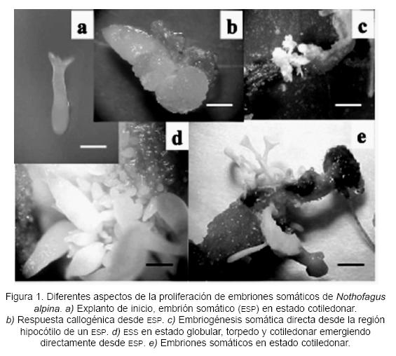 Gran parte de estas limitaciones puede ser superada mediante el establecimiento de micropropagación basado en la embriogénesis somática, que es la regeneración de un embrión a partir de células o tejidos somáticos diferenciados, constituyendo la expresión máxima de la totipotencia de la célula vegetal, como resultado del aislamiento, tanto espacial como fisiológico, de una célula o grupo celular (Toribio, 2003; Fehér, 2006). Actualmente, se ha conseguido inducir con éxito la embriogénesis somática en un número cada vez mayor de especies y explantos de inicio, principalmente en coníferas como Pinus taeda, Abies alba y Larix decidua, lo que ha propiciado su aplicación a escala operacional para la propagación masiva de genotipos selectos (Zoglauer et al., 2003). En el caso de N. alpina se ha conseguido inducir exitosamente masas proembriogénicas y regeneración de embriones somáticos viables desde explantos cotiledonares extraídos desde semillas maduras provenientes del huerto semillero clonal Huillilemu, ubicado en la provincia de Valdivia, décima región de Chile (Castellanos et al., 2005).