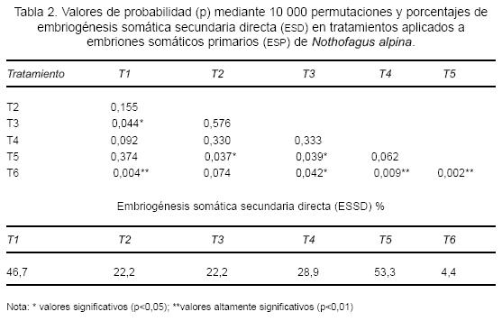 Diseño experimental y análisis estadistico. Se estableció un diseño experimental completamente al azar. La unidad experimental correspondió a una placa petri de 9 cm de diámetro, conteniendo nueve ESP, con cinco repeticiones. La unidad muestral correspondió a cada ESP. Al cabo de seis semanas se evaluó el porcentaje de explantos (ESP) con embriogénesis secundaria directa (ESSD), porcentaje de explantos con callogénesis, número de embriones somáticos secundarios (ESS) en estado cotiledonar y torpedo por ESP y peso fresco (mg) del macizo de proliferación.